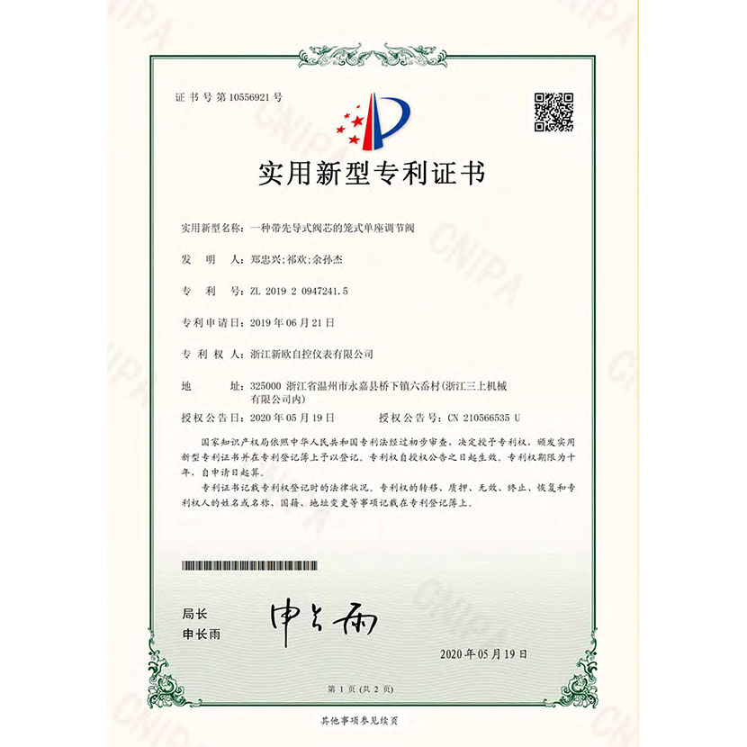 一種帶先導式閥芯的籠式單座調節閥 專利證書